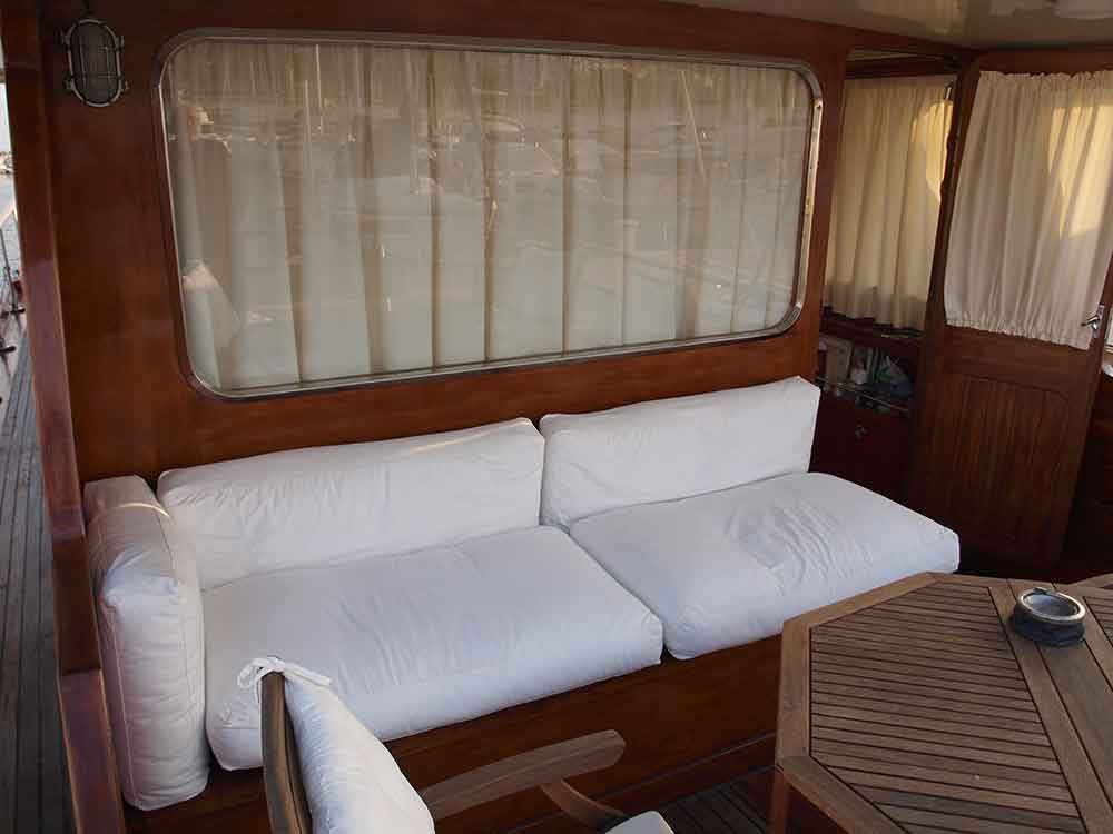 Between the Sixties and beginning of the Eighties a British Yard called Dagless built a sucessful range of power yachts based upon a design from Jack Francis Jones: the Fleur de Lys of which different versions ranging from 50' to 98' where built. Towards the mid Sixties, three different families of the Catalan gentry placed an order for three 20 m. boats at the Astilleros Viudes (founded in 1940) based on the Fleur de Lys design. They were the Geno, the Danae and the Amusco IV. Having the same hull lines, each one differed from the other on the deck and internal lay-out. They formed a Mediterranean improvement on the original Fleur de Lys design. In fact, the life “en plein air” was better cared of and the internal comfort well detailed. All three boats, of a very high craftmanship and much more opulently finished than the original British built boats, are still sailing nowadays: the Geno in Italy, while the Danae and Amusco IV still in Spanish waters. The Amusco IV was restored a few years ago. She received a full check to the hull, cleaning and painting inside, new engines, new electric and hydraulic systems, new galley and furniture equipment. More recently her owner has rebuilt the decks, replaced some beams and serviced the equipment. The transom is totally new. She has since sailed very little, always being maintained in good shape and the engines show very low hours. Today he is about to mount new electronics and ask for a new Official inspection to get out sailing again.