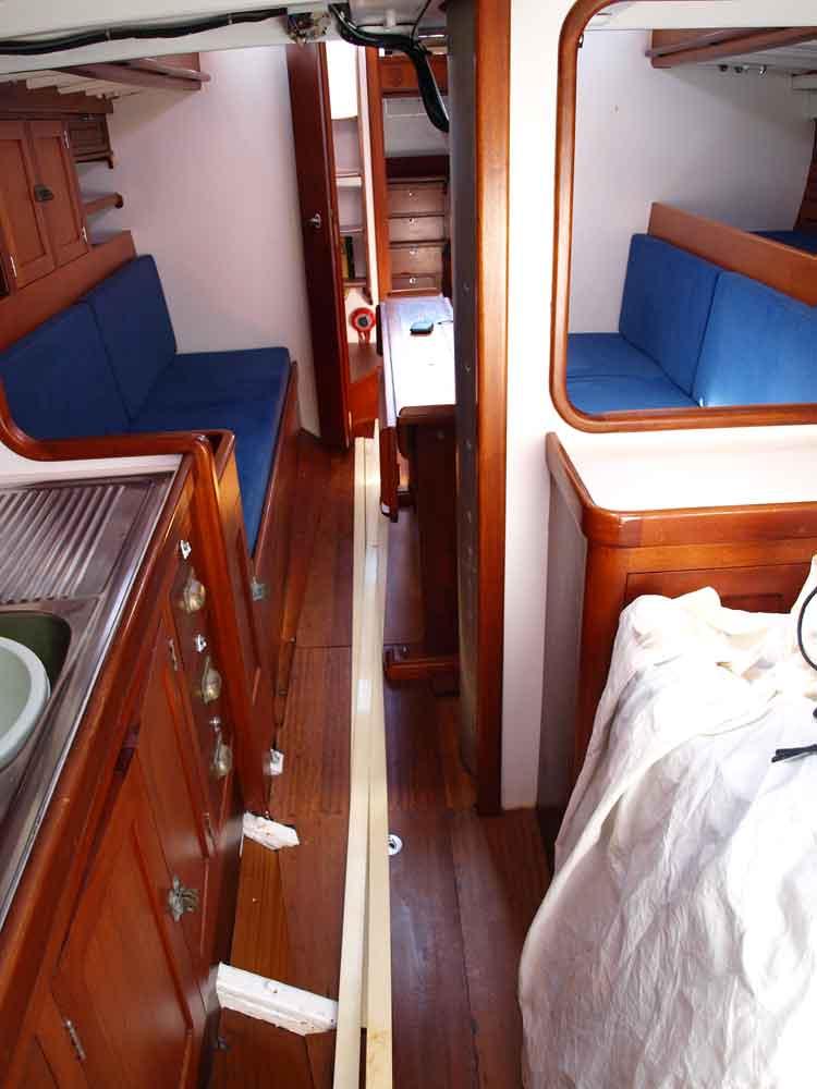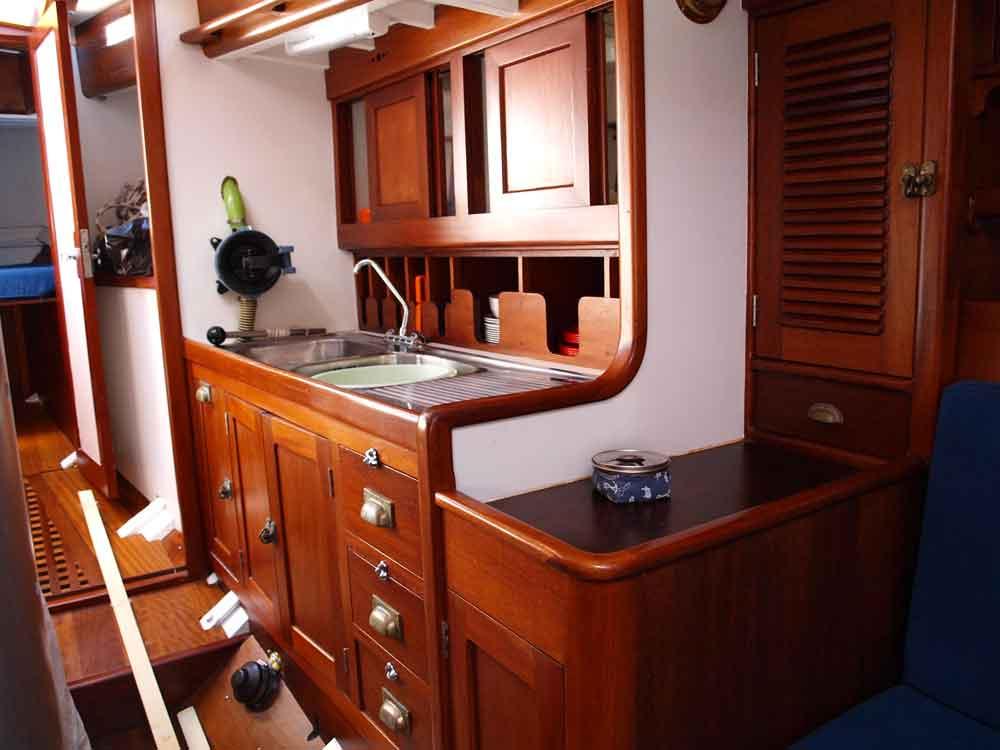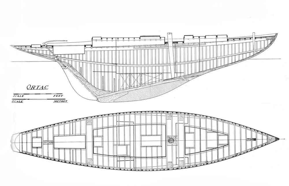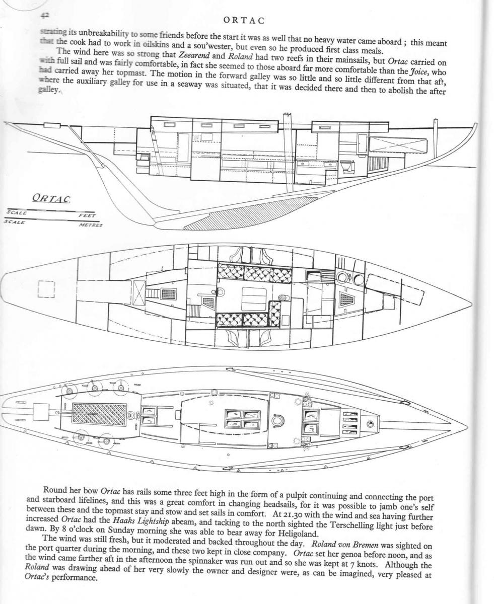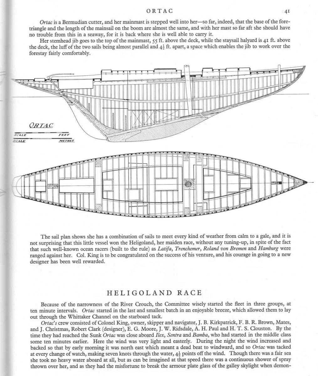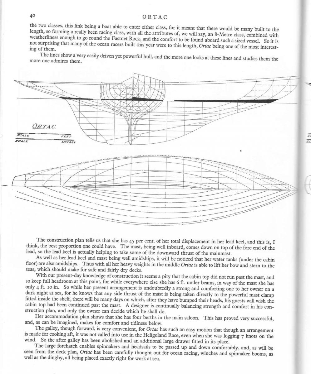 The Ortac is a historical vessel. She was the second design of Robert Clark (the first, Mystery, was only 26 feet long on water line) and she won her first race, even if she was not yet properly tuned, against the most important ocean racers of the moment. She started the famous career of her designer, comparable to that of Olin Stephens himself, who had quite the same age. Her particular rig, with a mast stepped well aft of the standard of the moment, made her sail plan divided fifty/fifty between main and genoa. Ortac winning career lasted decades and nowadays she continues to be in quite original conditions. She is being restored by a well known shipwright, following the indications of a recent survey. These works are included in the asking price, recently reduced.