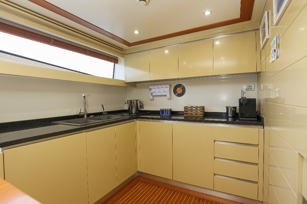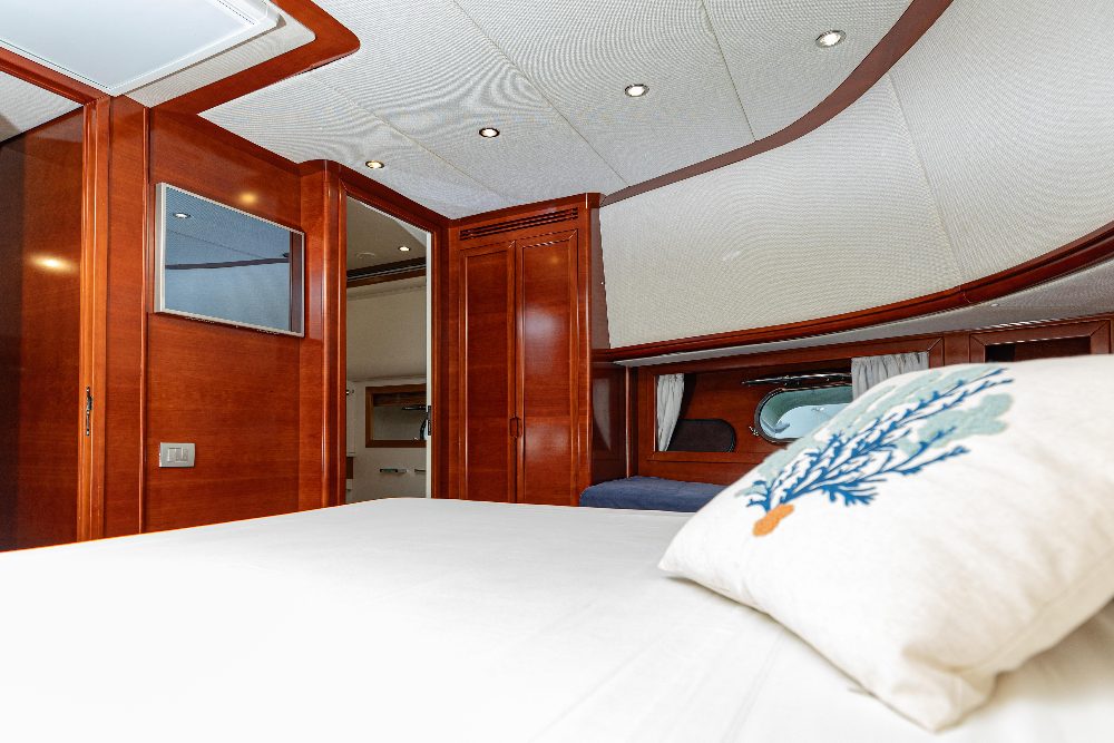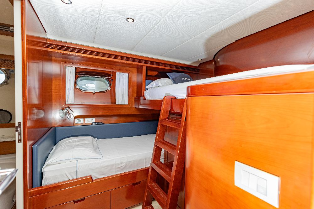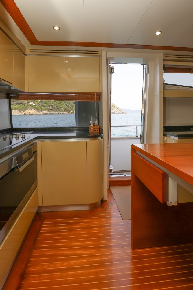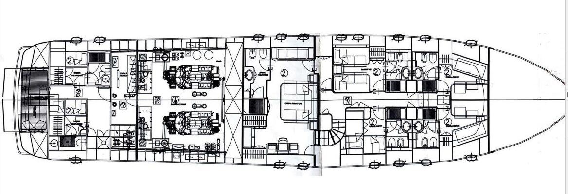When Mario Diano founded his shipyard in 1979, the news came as a surprise in the Italian nautical world for its originality: he was going to build large yachts in wood! In a world that had already switched to fibreglass and decreed the closure of many traditional shipyards, unable to match the competition. And Diano was able to assert itself on the market, year after year, with boats of the highest quality, offering every owner the pleasure and exclusivity of owning a unique object, each one different from the others. Each Diano is built in a specific way, with an absolutely spectacular craftsmanship and level of finishing and with a design that, within the traditional guidelines of planing yachts, has its own personality, unquestionable and very elegant. A personality that keeps them modern, beyond passing fashions. In 2007 Mario Diano retired and sold his shipyard to the Rizzardi Group, who maintained the shipyard's founding philosophy and the quality of the work of its staff. Unfortunately, the world crisis that broke out that year had a serious impact on the group, which closed down in 2011. The Gioia is thus one of the last Diano built and among the largest in the shipyard (behind the 33-metre Santa series). Her elegant and dynamic design blends taut lines and refined curvatures with fine wisdom. On deck, she offers different levels for sun and shade: spacious outdoor entertaining areas in the bow and flybridge and under cover in the large aft saloon are shared with entertaining and socialising areas in the aft cockpit and in the large indoor dinette, overlooking the sea. The cabins are spacious, particularly the amidships owner's cabin, which occupies the full beam and is accessed by a private lobby in front of the stairs leading up to the saloon, and the high-level guest cabin at the bow, which benefits from very elegant furnishings that follow the curvatures of the hull in a very artistic manner. In fact, all the finishes are made with a care and quality that deserves the appellation of art. The construction follows the very high standards of the shipyard: keel and stem of laminated wood (ten 20 mm planks), solid wood sternpost. Six solid wood stringers and solid wood shelf. The engine room bilge stringers supporting the engines are reinforced by a steel structure that completely covers them. Armour-plated plywood (i.e. double ply) with Khaya mahogany outer planking for the hull construction. Half metre high plywood false keel. Plywood topsides. Ash frames, mahogany beams, teak deck and superstructures of solid wood, laminated and plywood as required. The Gioia (which means joy and also jewel in Italian) is in excellent maintenance and seaworthy condition. Many accessories have been recently replaced and the mandatory maintenance guidelines for this type of boat have been constantly followed to keep her at the top of her condition.